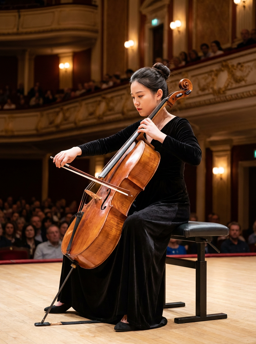model as classical musician, formal concert attire, elegant sophisticated pose, concert hall background