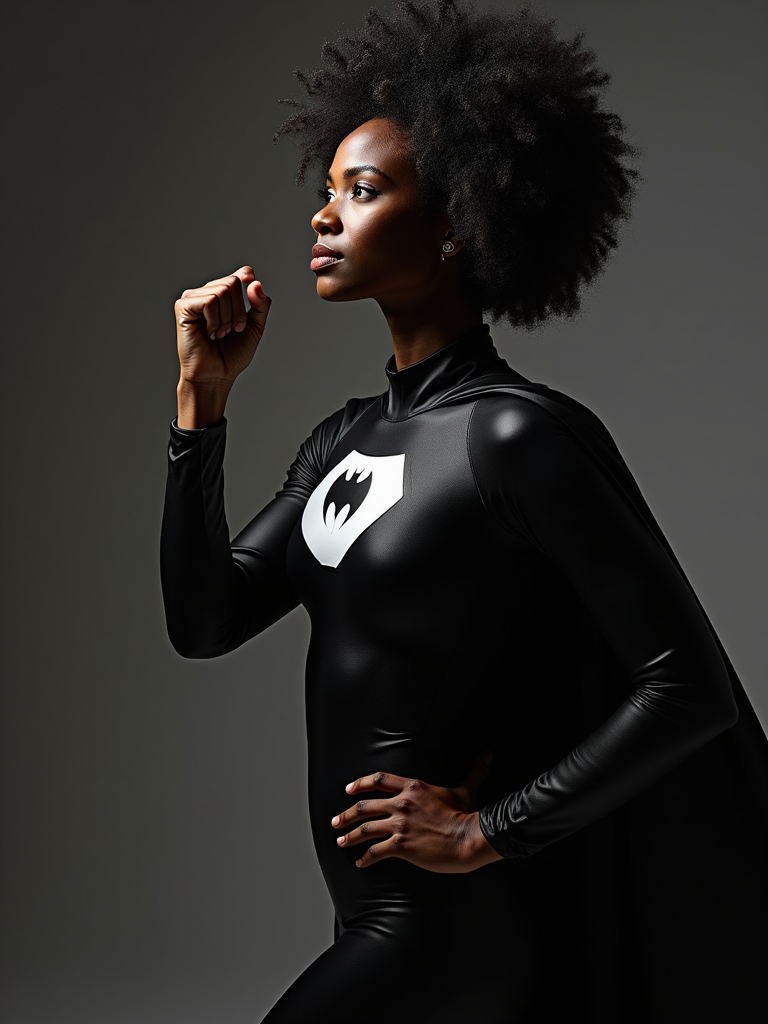 model as comic book hero, studio lights, wearing a form-fitting superhero outfit with a cape , action pose, dramatic shadows