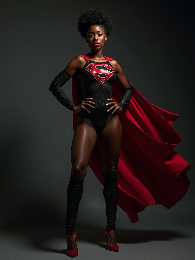 model as comic book hero, studio lights, wearing a form-fitting superhero outfit with a cape , action pose, dramatic shadows