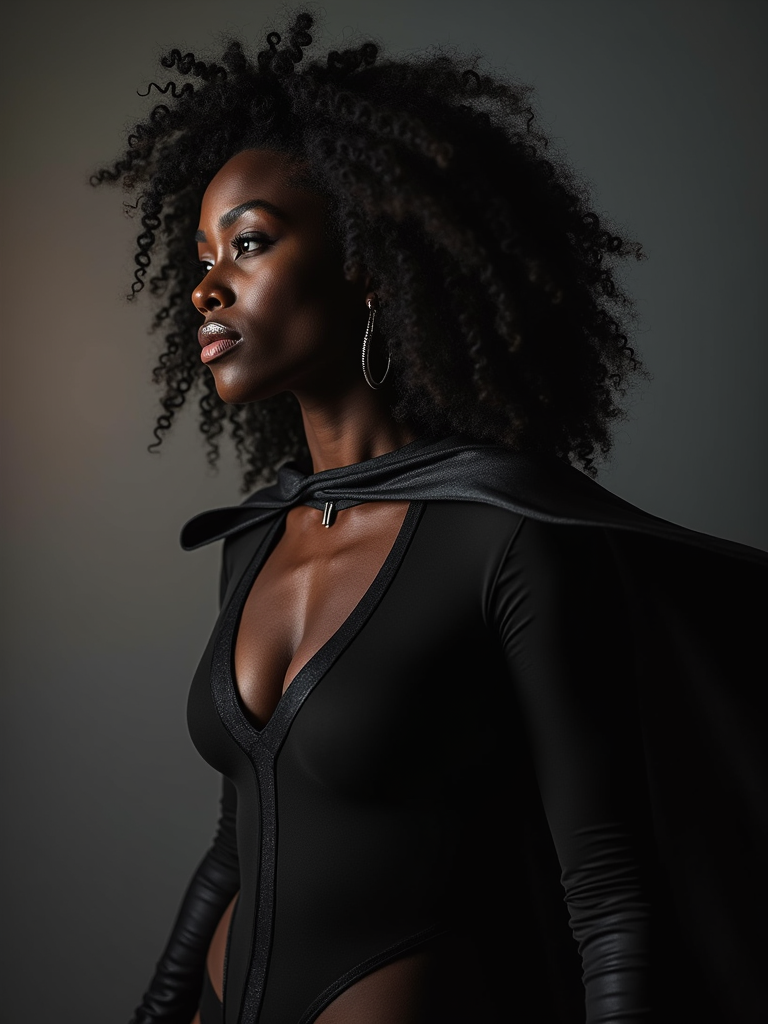 model as comic book hero, studio lights, wearing a form-fitting superhero outfit with a cape , action pose, dramatic shadows