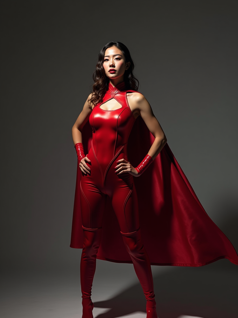 model as comic book hero, studio lights, wearing a form-fitting superhero outfit with a cape , action pose, dramatic shadows