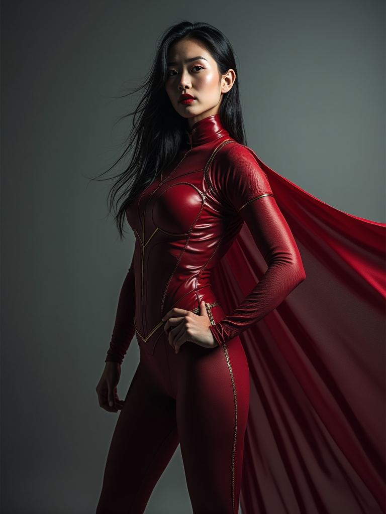 model as comic book hero, studio lights, wearing a form-fitting superhero outfit with a cape , action pose, dramatic shadows