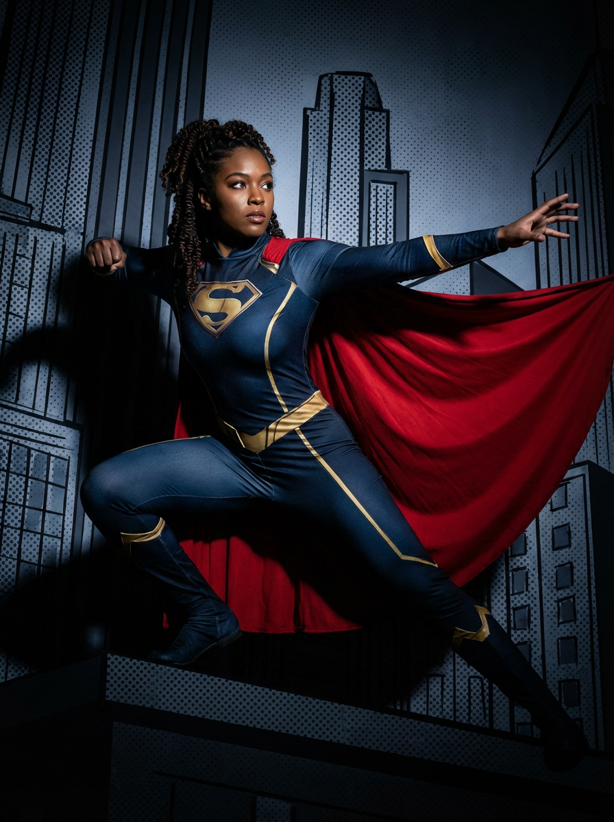 model as comic book hero, studio lights, wearing a form-fitting superhero outfit with a cape , action pose, dramatic shadows