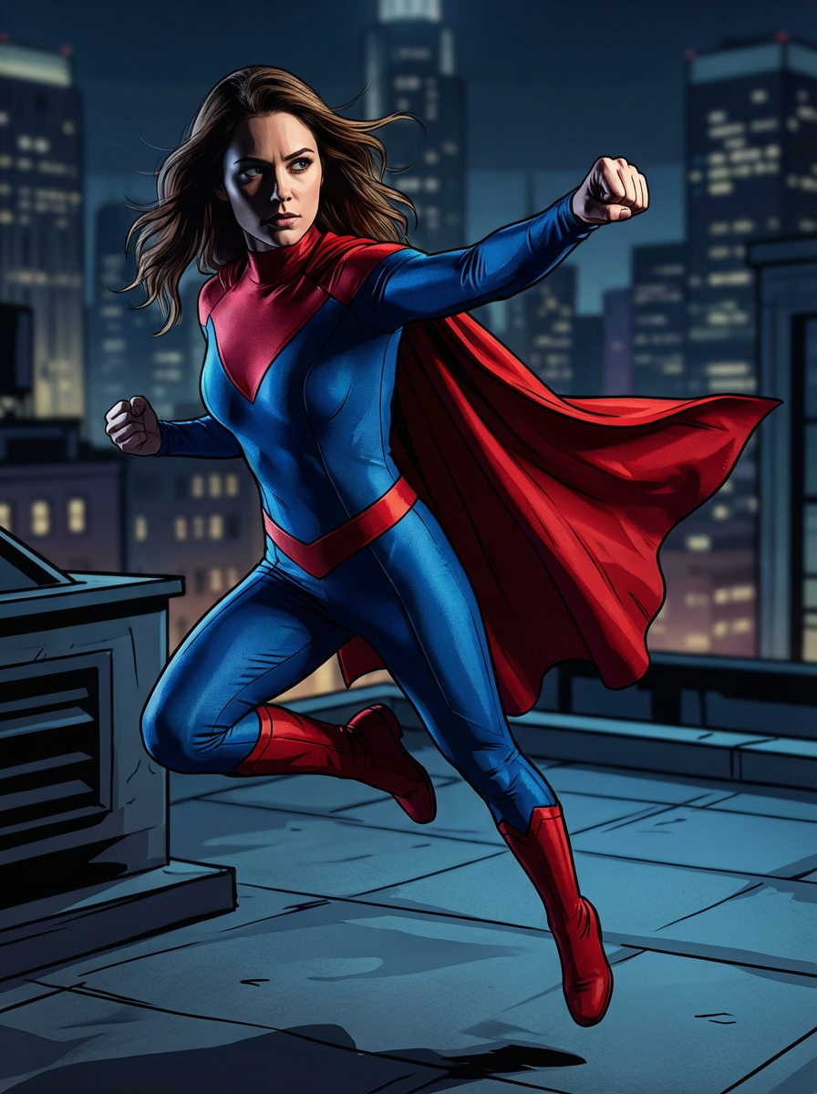 model as comic book hero, studio lights, wearing a form-fitting superhero outfit with a cape , action pose, dramatic shadows
