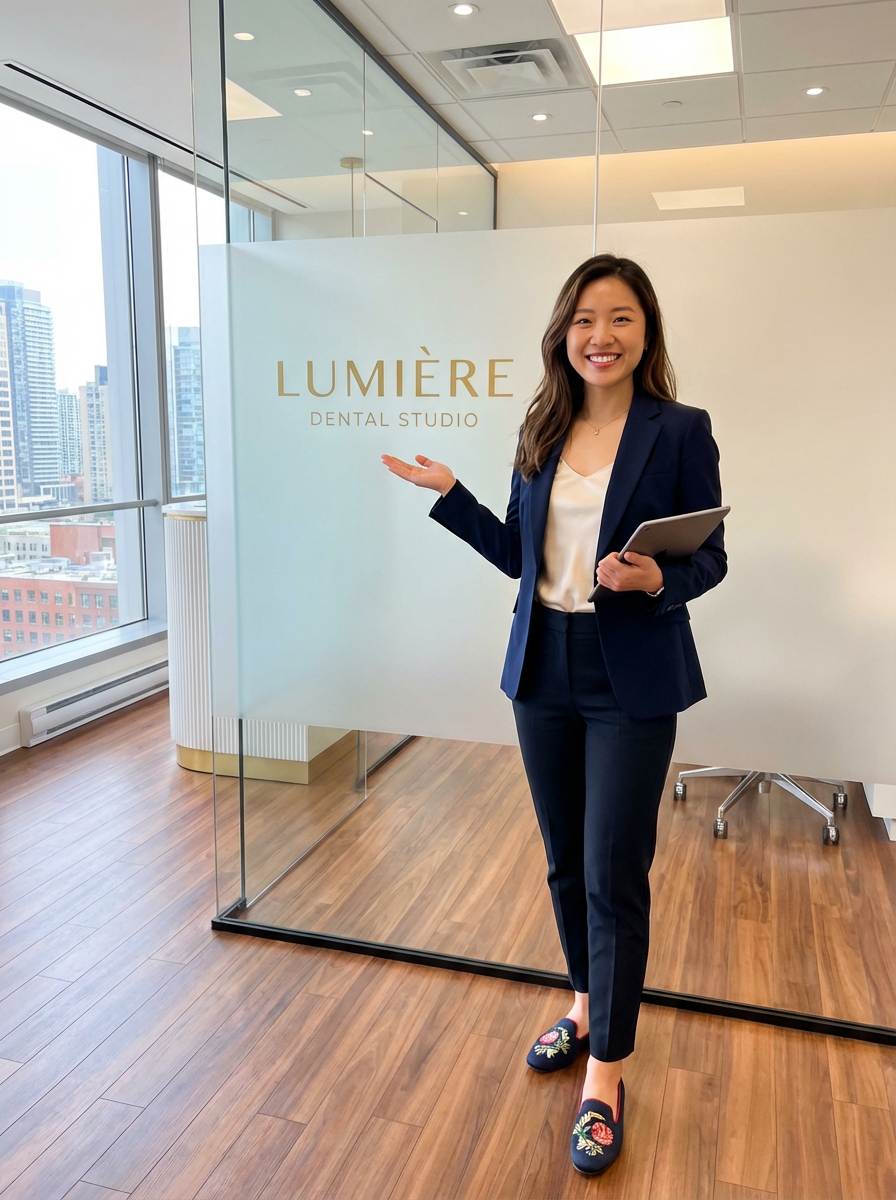 model as cosmetic dentist, stylish professional attire, bright perfect smile, upscale dental office
