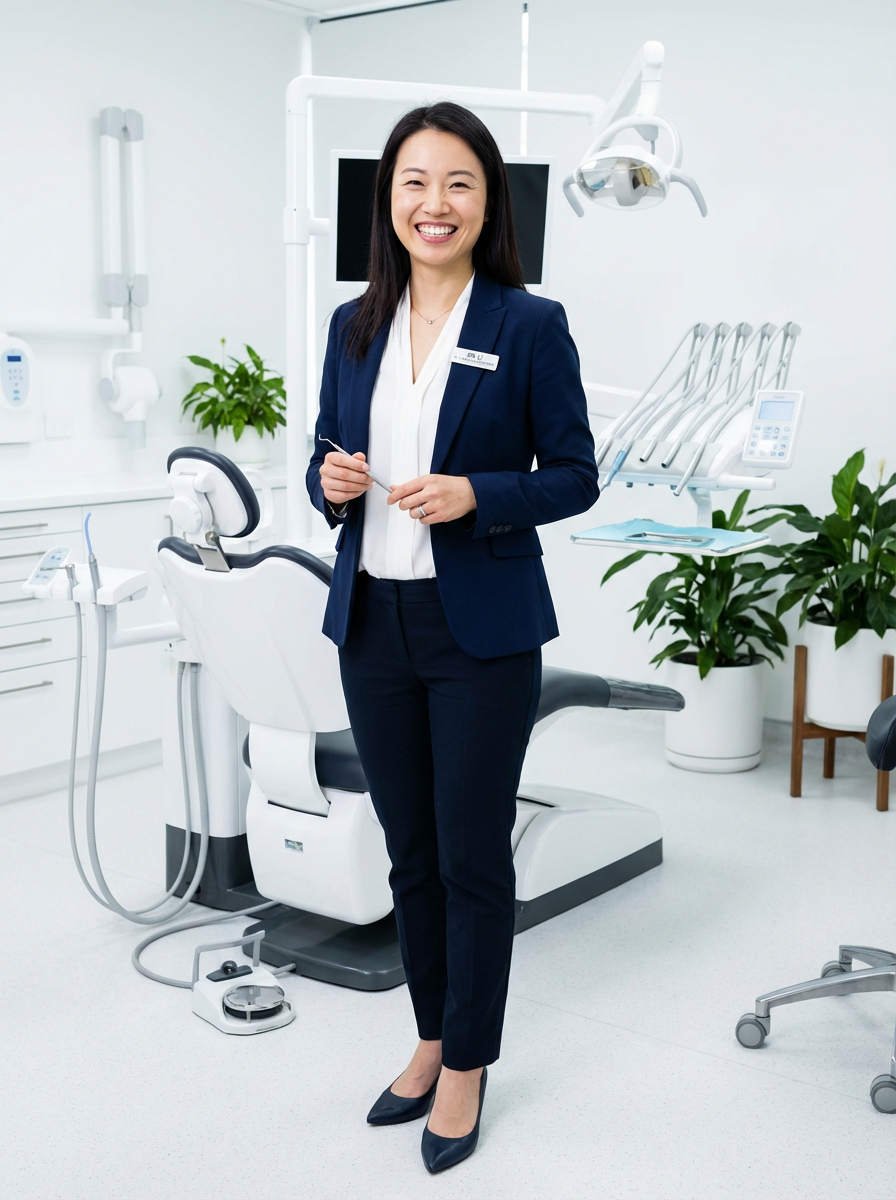 model as cosmetic dentist, stylish professional attire, bright perfect smile, upscale dental office