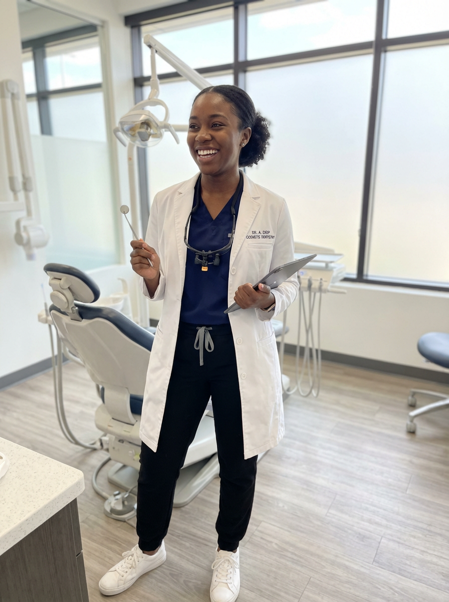 model as cosmetic dentist, stylish professional attire, bright perfect smile, upscale dental office