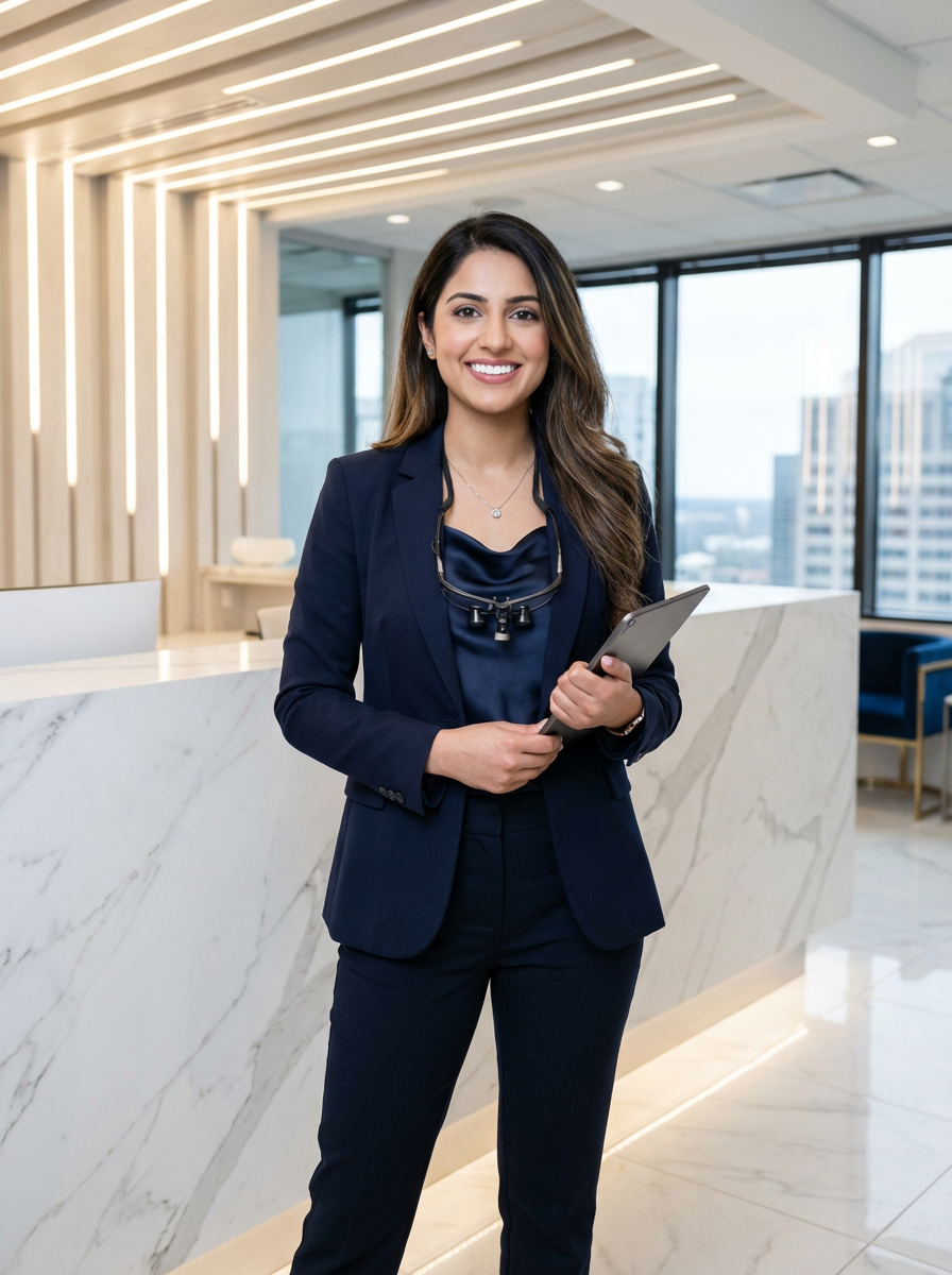 model as cosmetic dentist, stylish professional attire, bright perfect smile, upscale dental office