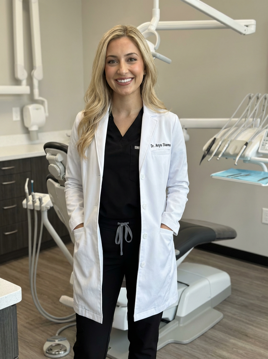 model as cosmetic dentist, stylish professional attire, bright perfect smile, upscale dental office