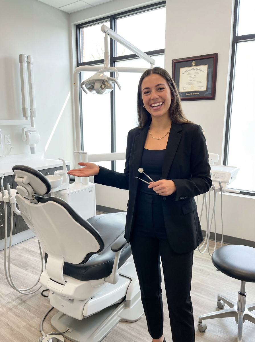 model as cosmetic dentist, stylish professional attire, bright perfect smile, upscale dental office
