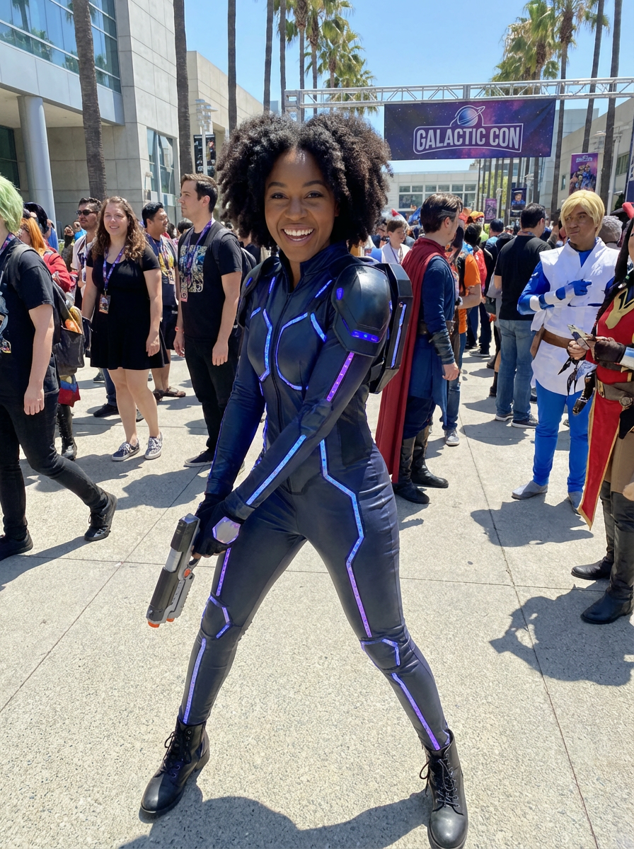 model as cosplayer at an outdoor convention, wearing a sexy sci-fi bodysuit with glowing elements , vibrant cosplay atmosphere, surrounded by fans and cosplayers, dynamic poses