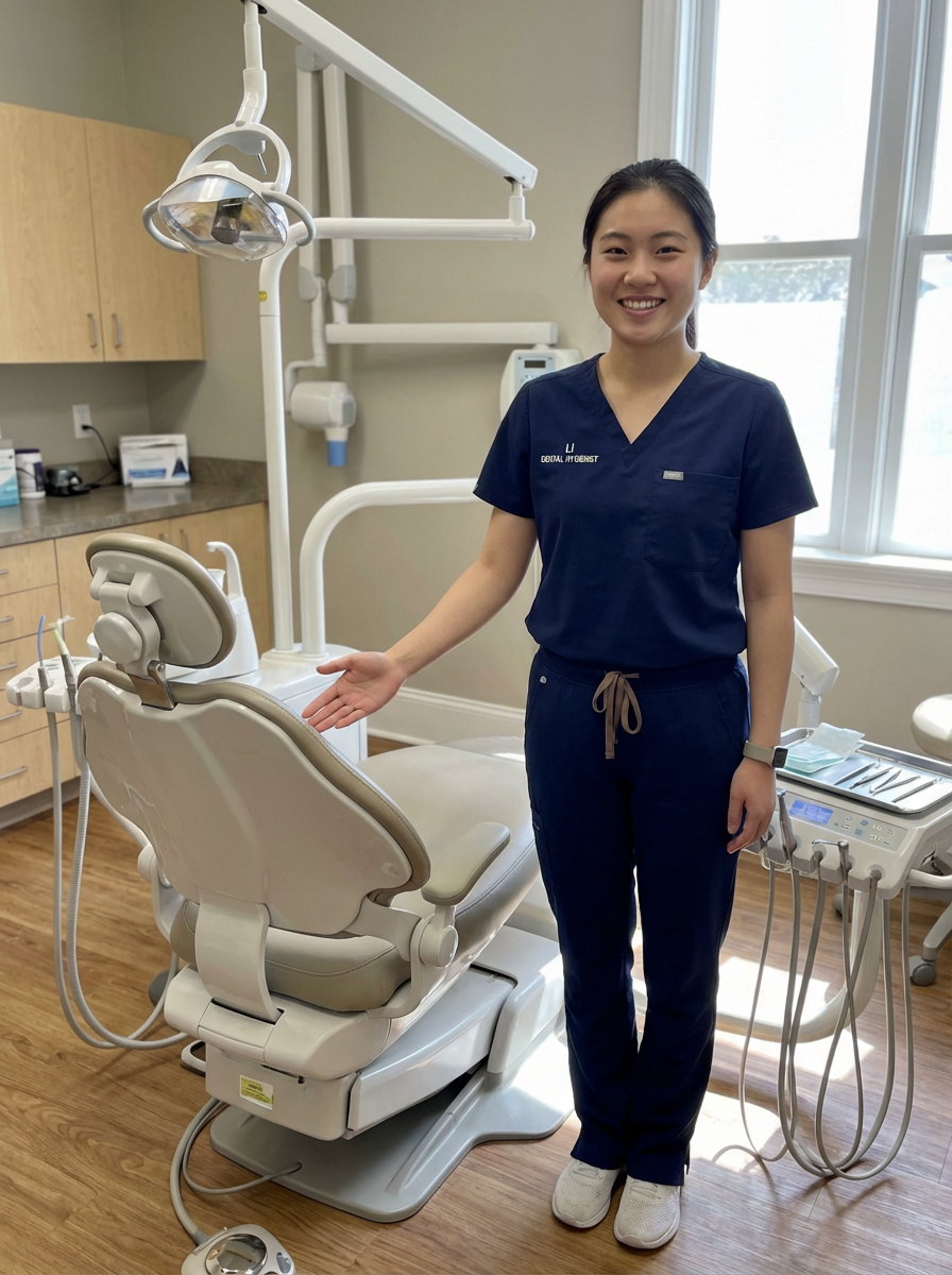 model as dental hygienist, clean scrubs, warm welcoming smile, dental operatory background