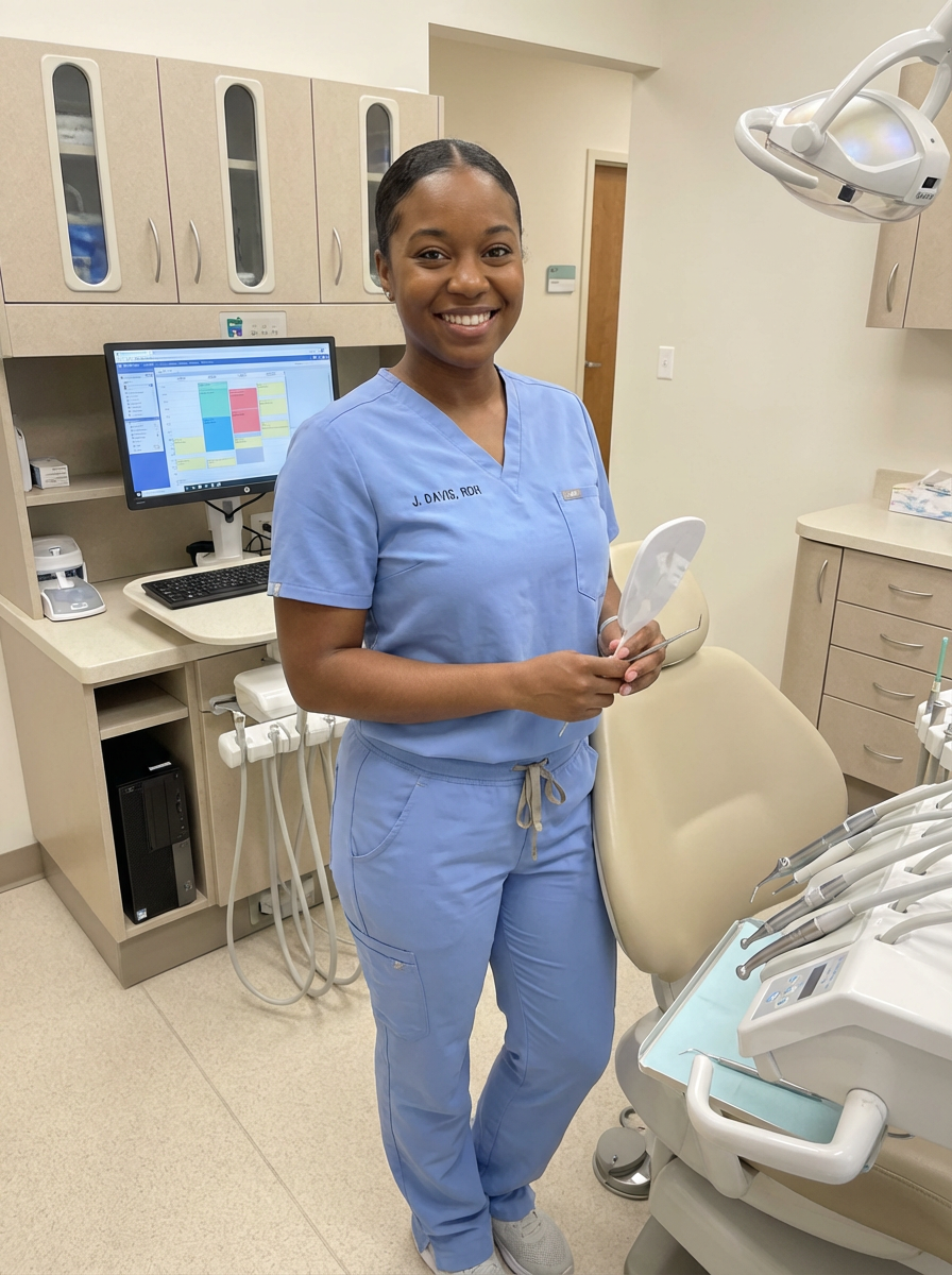 model as dental hygienist, clean scrubs, warm welcoming smile, dental operatory background