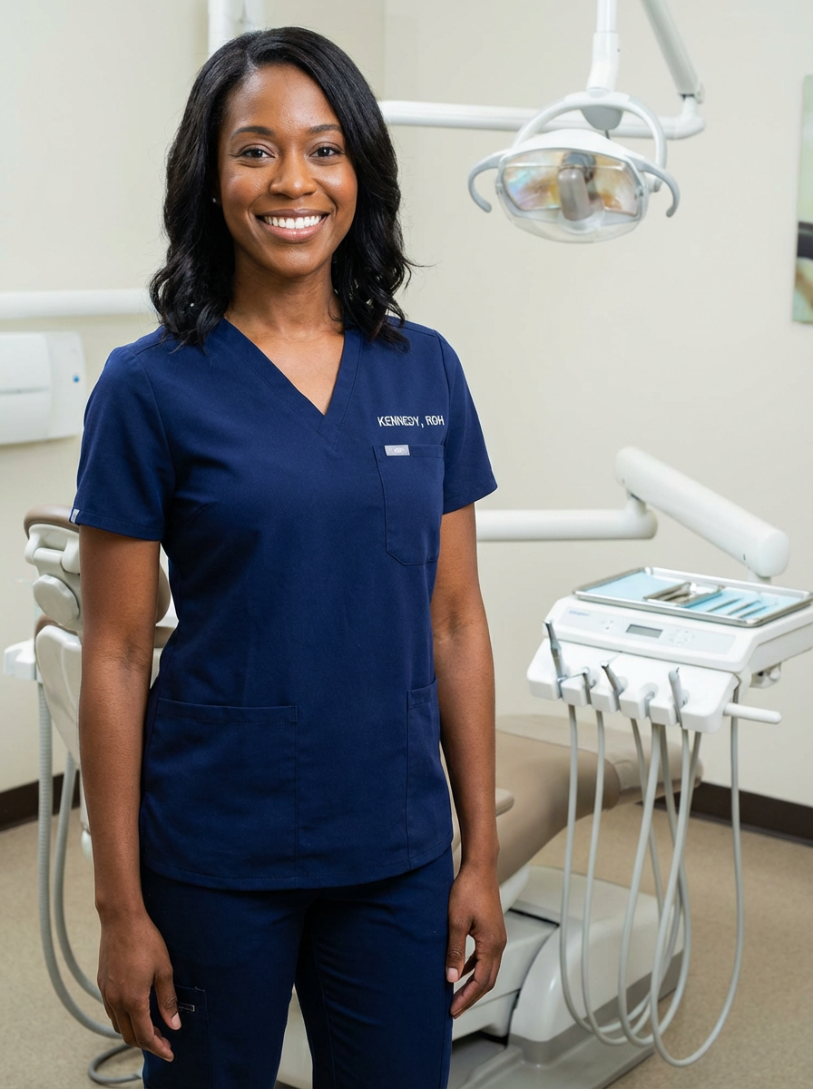 model as dental hygienist, clean scrubs, warm welcoming smile, dental operatory background