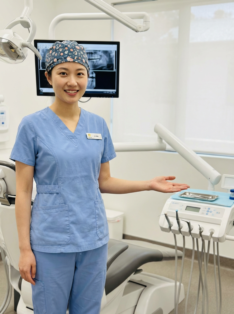 model as dental hygienist, clean scrubs, warm welcoming smile, dental operatory background