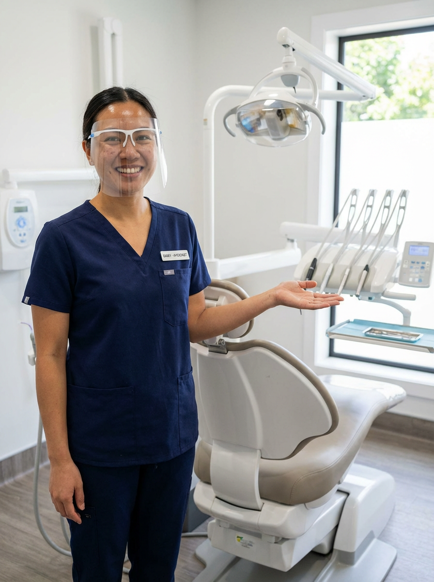 model as dental hygienist, clean scrubs, warm welcoming smile, dental operatory background