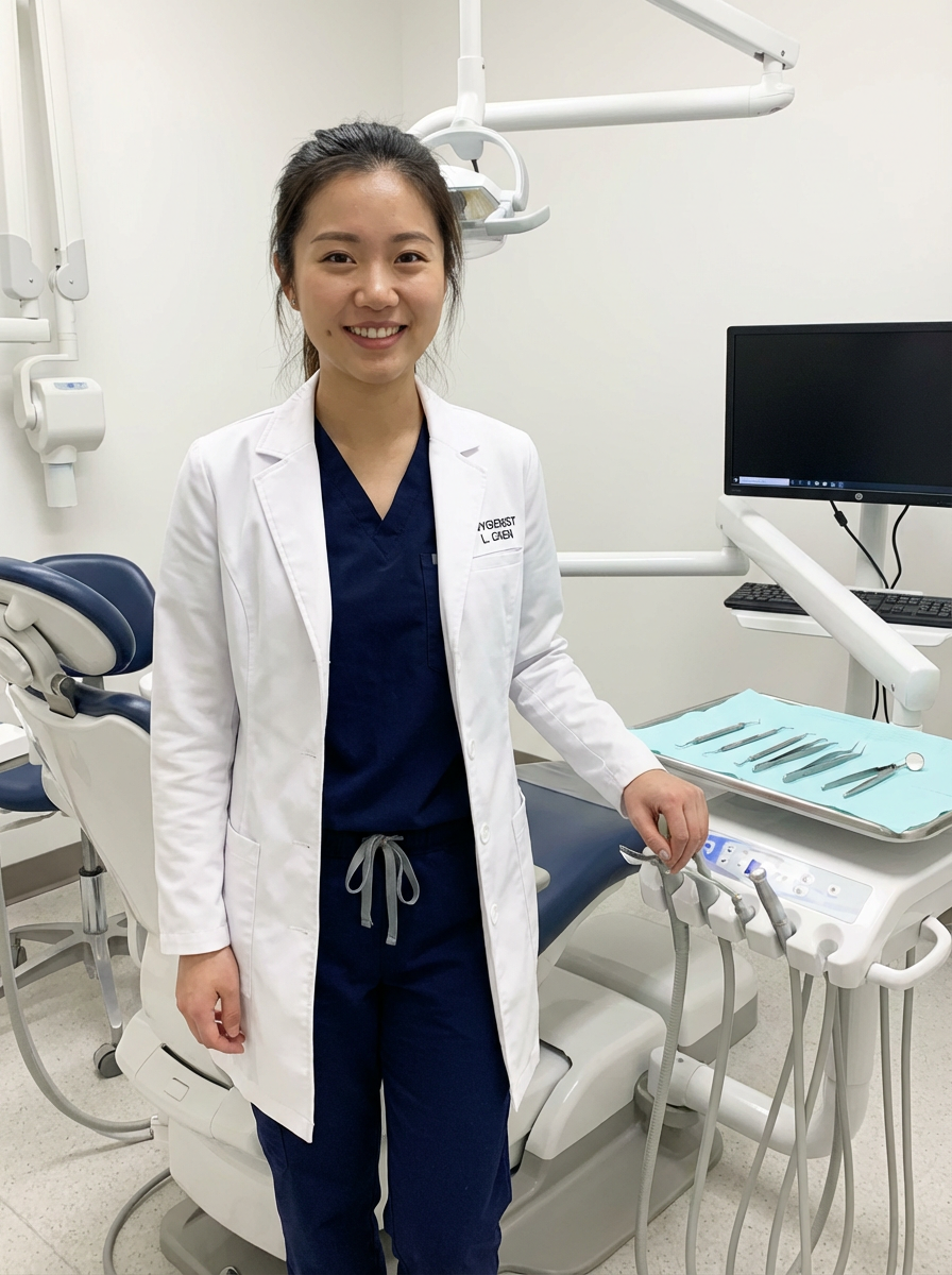 model as dental hygienist, clean scrubs, warm welcoming smile, dental operatory background