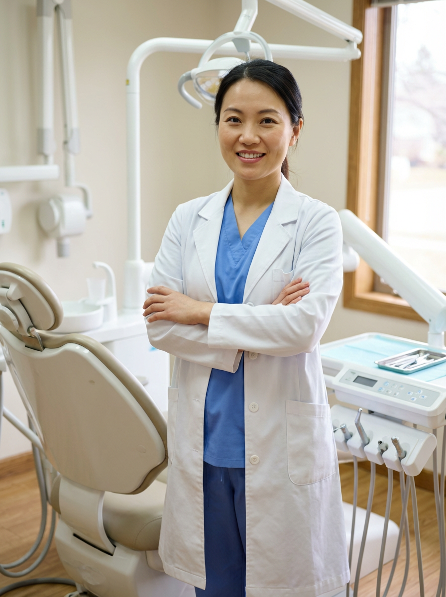 model as dental professional, wearing scrubs and lab coat, friendly reassuring expression, dental clinic setting