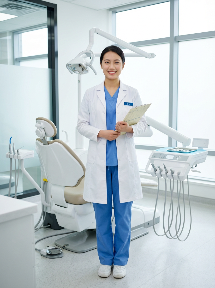 model as dental professional, wearing scrubs and lab coat, friendly reassuring expression, dental clinic setting