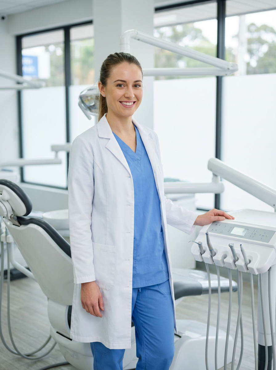 model as dental professional, wearing scrubs and lab coat, friendly reassuring expression, dental clinic setting