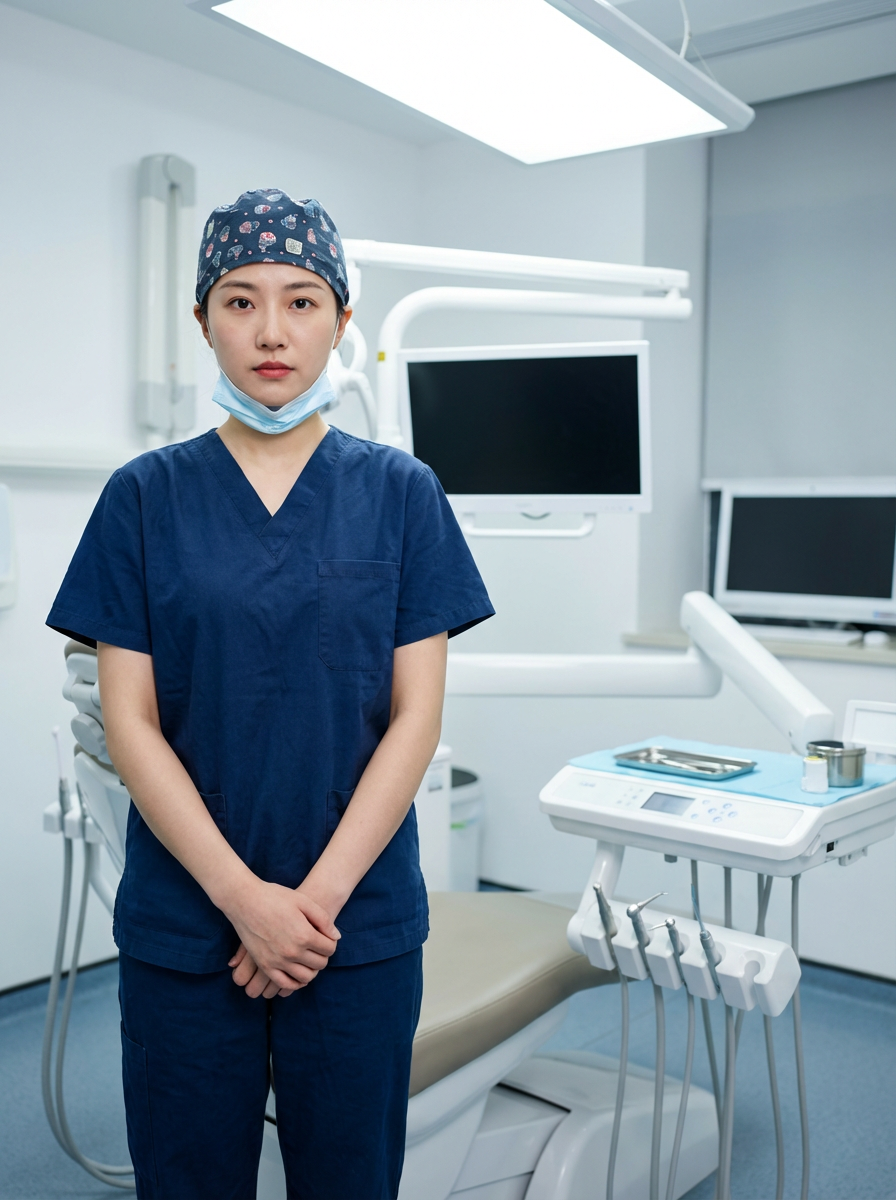 model as dental surgeon, surgical scrubs and cap, competent serious expression, sterile environment
