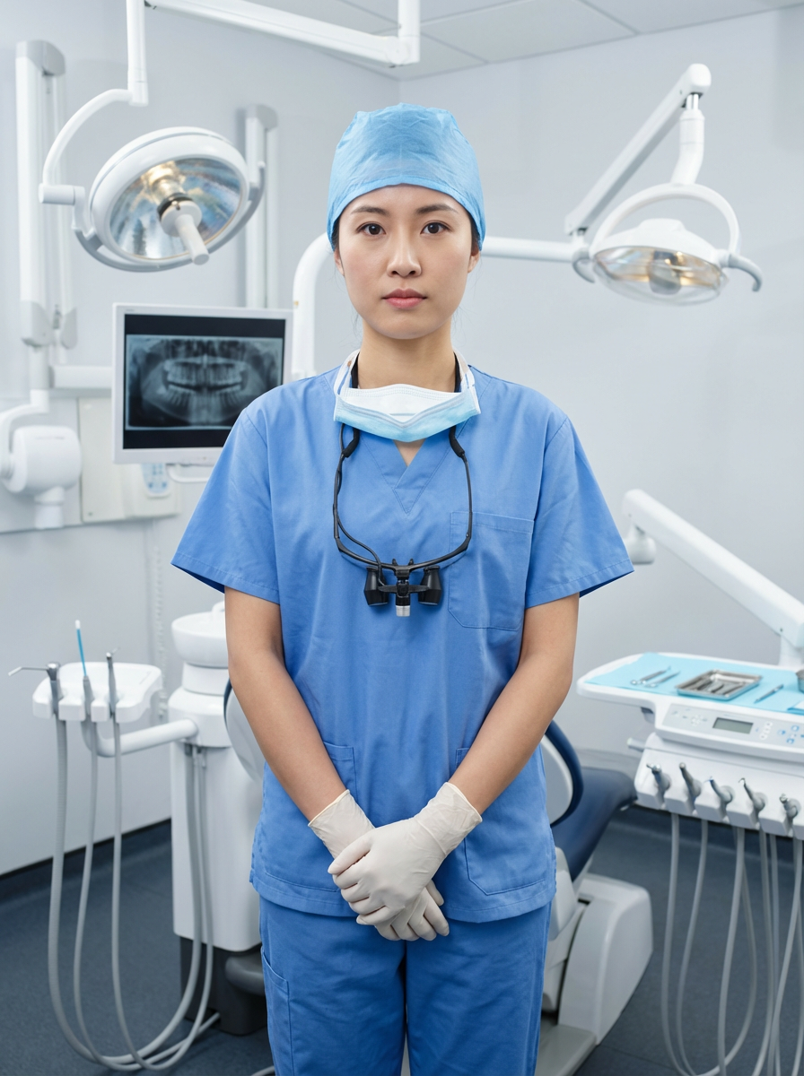 model as dental surgeon, surgical scrubs and cap, competent serious expression, sterile environment
