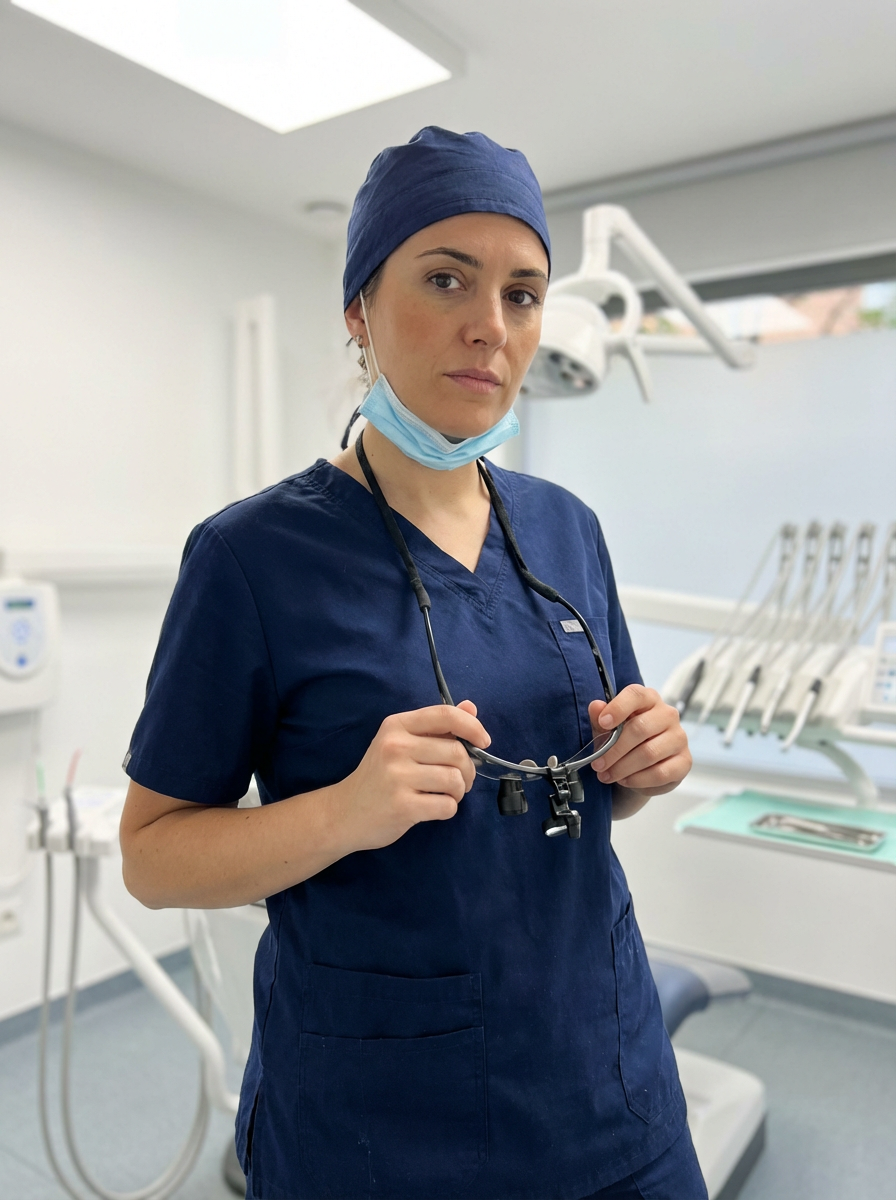 model as dental surgeon, surgical scrubs and cap, competent serious expression, sterile environment
