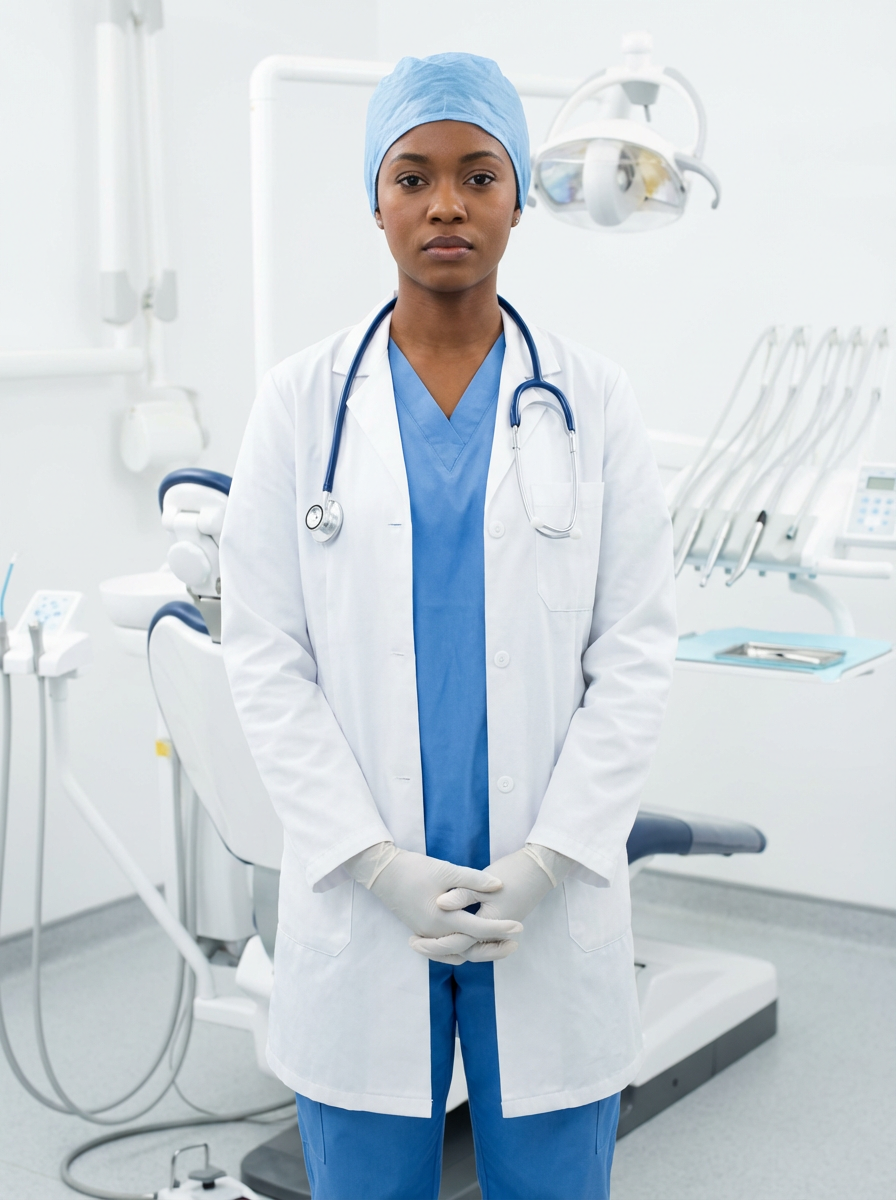 model as dental surgeon, surgical scrubs and cap, competent serious expression, sterile environment