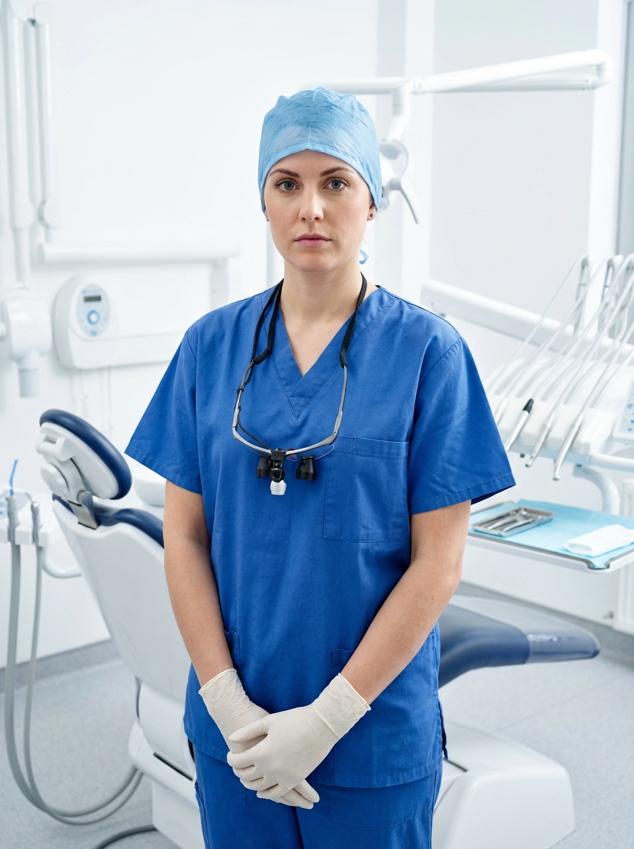 model as dental surgeon, surgical scrubs and cap, competent serious expression, sterile environment