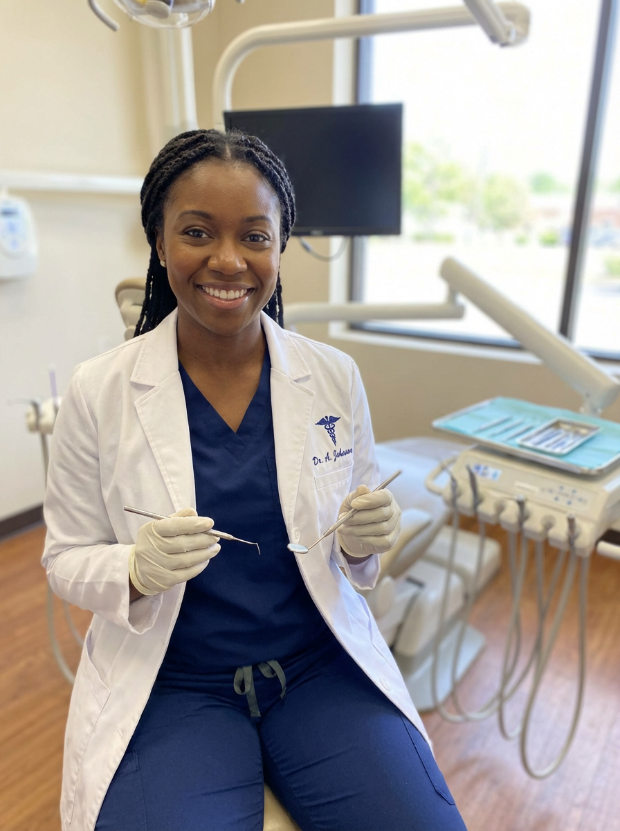 model as dentist with dental tools in background, confident professional demeanor, clean clinical environment