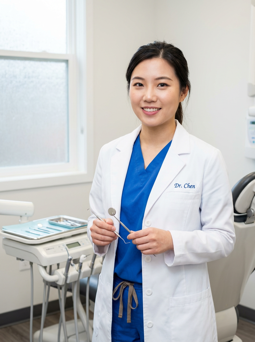 model as dentist with dental tools in background, confident professional demeanor, clean clinical environment