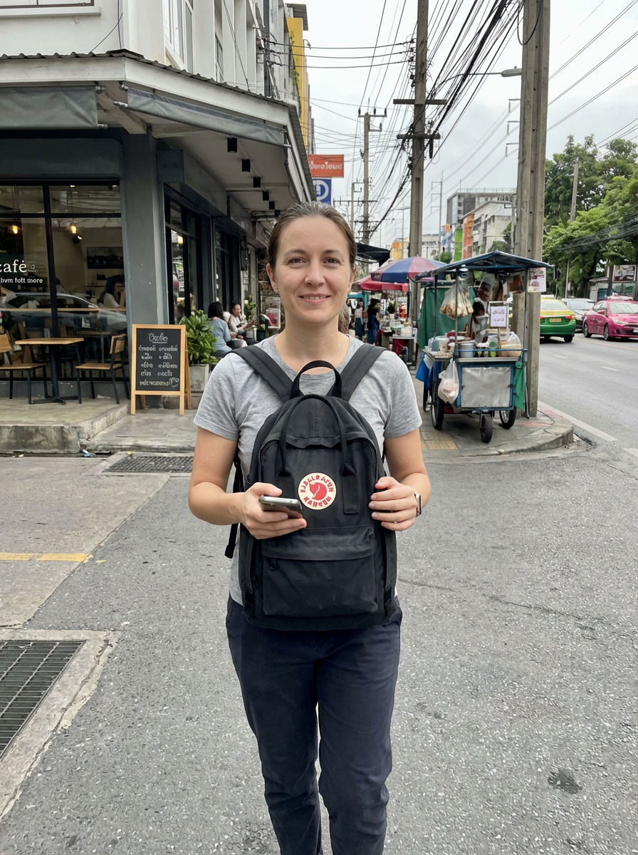 model as digital nomad in Bangkok in Ekkamai district, with backpack