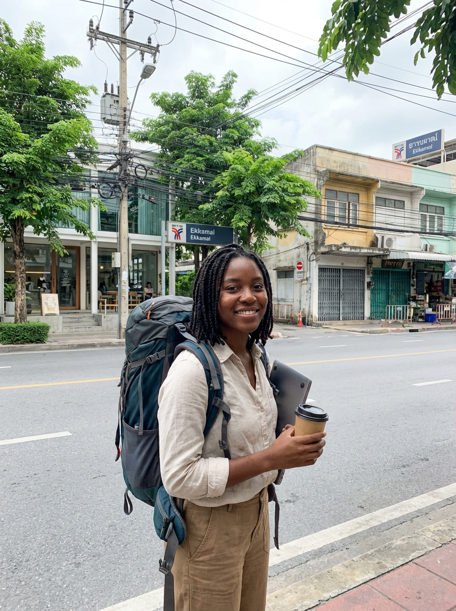 model as digital nomad in Bangkok in Ekkamai district, with backpack