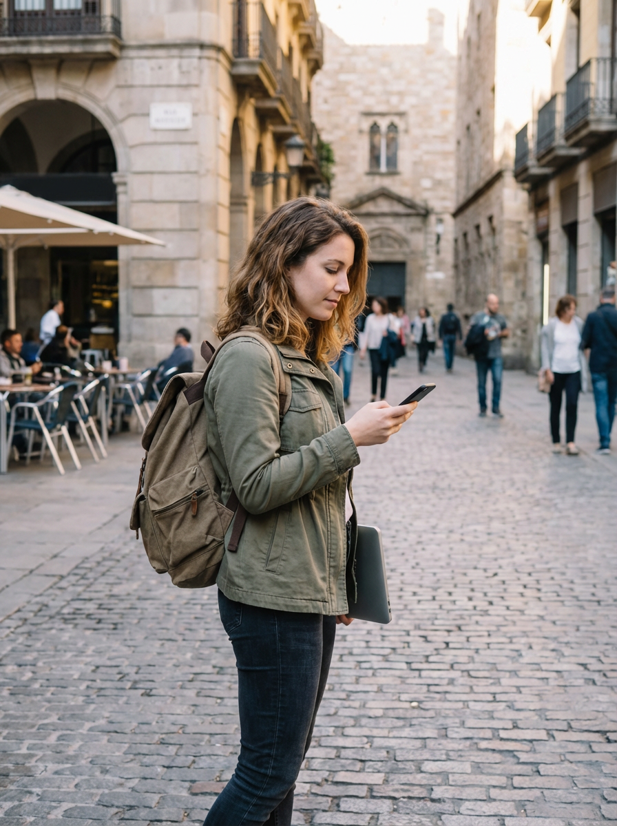 model as digital nomad in Barcelona center, with backpack