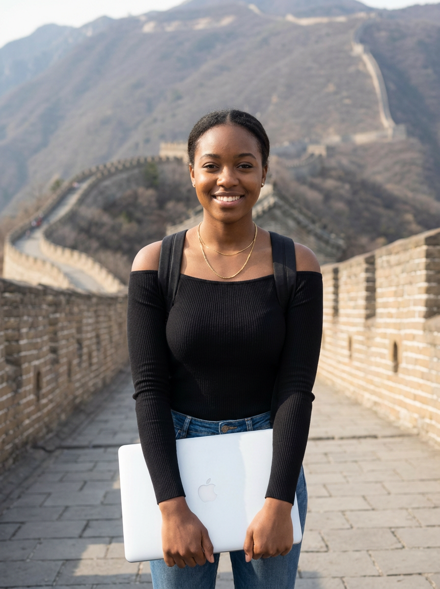 model as digital nomad in Beijing with the Great Wall in the background, with backpack