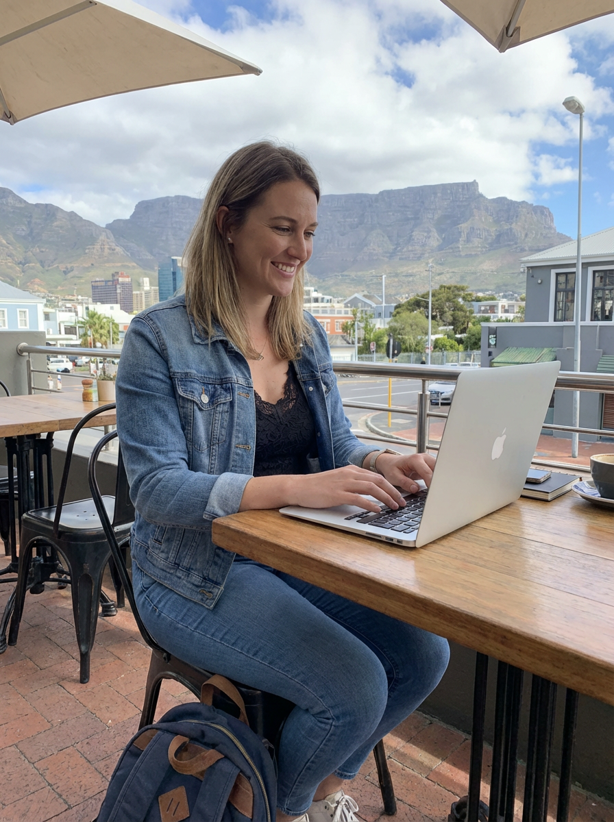 model as digital nomad in Cape Town with the Table Mountain in the background, working on laptop