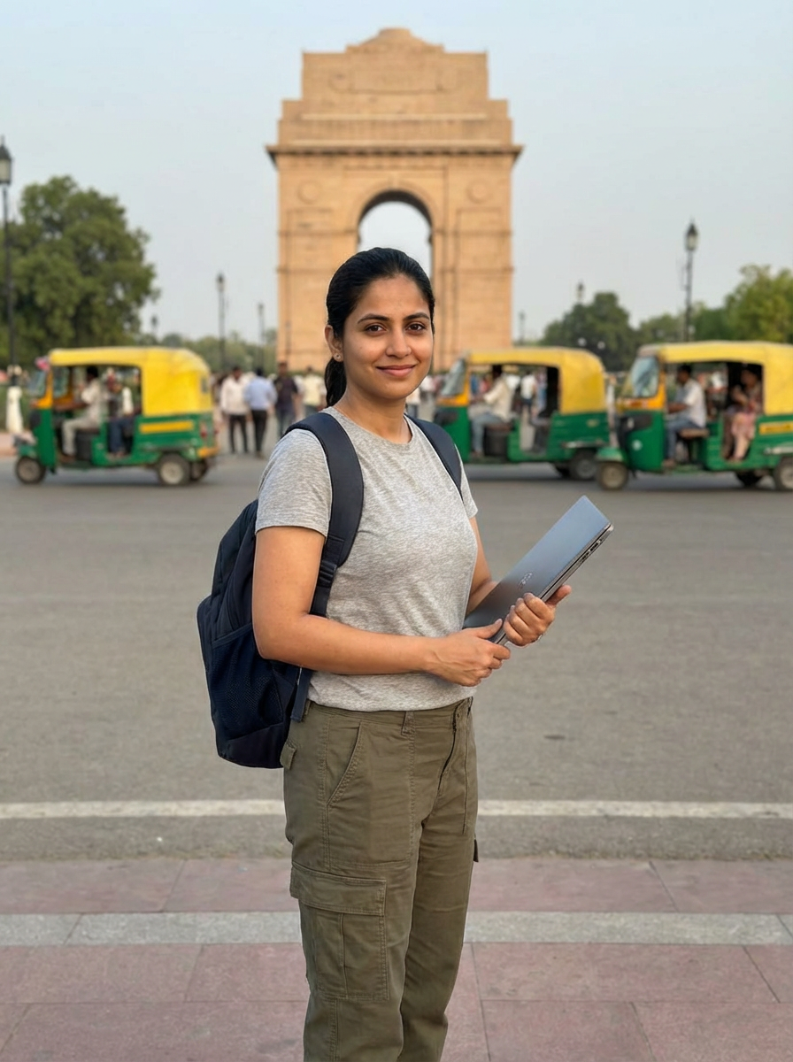 model as digital nomad in Delhi with the India Gate in the background, with backpack