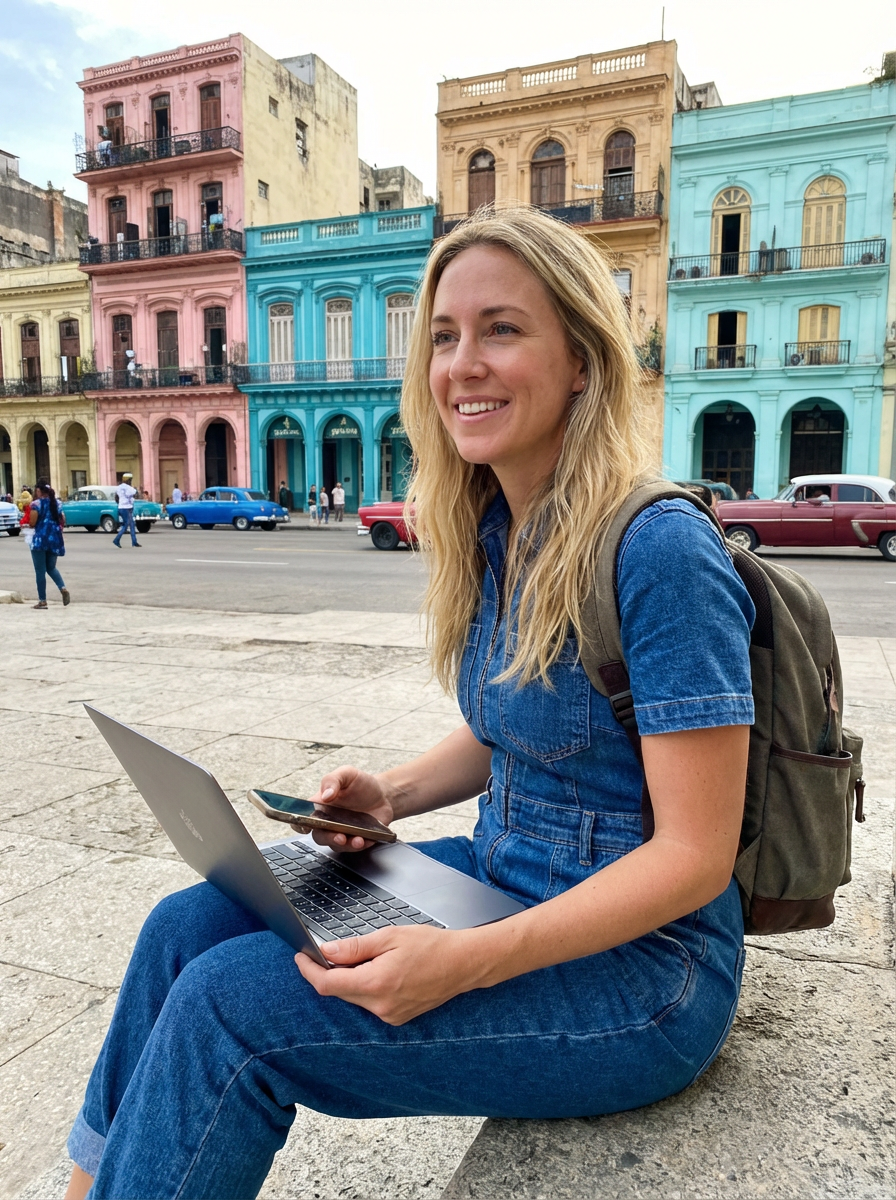 model as digital nomad in Havana with the colorful old town in the background, with backpack
