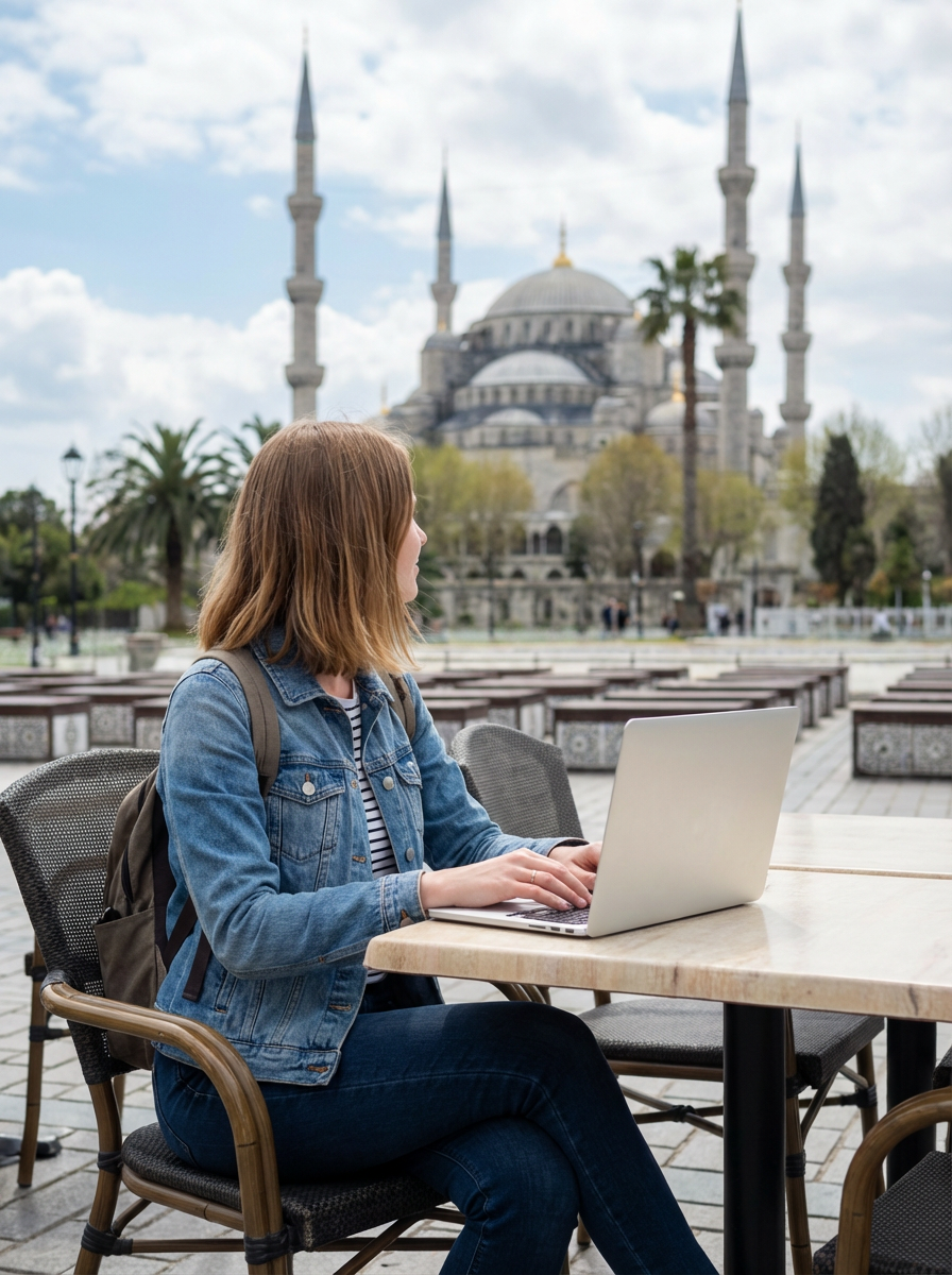 model as digital nomad in Istanbul with The Mosque in background, with backpack