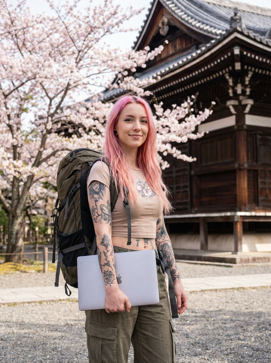 model as digital nomad in Japan with Japanese Cherry Blossom Trees and Japanese temples in background, with backpack