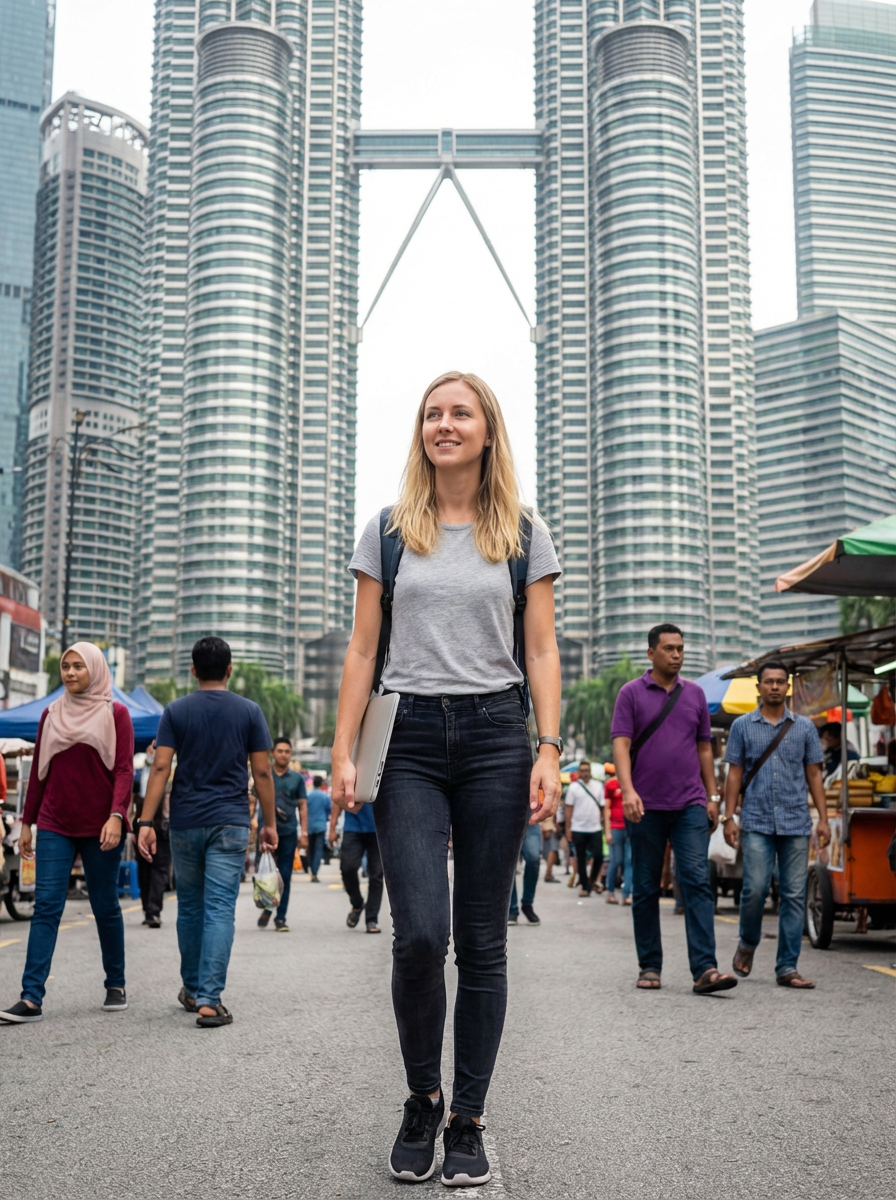 model as digital nomad in Kuala Lumpur, with backpack