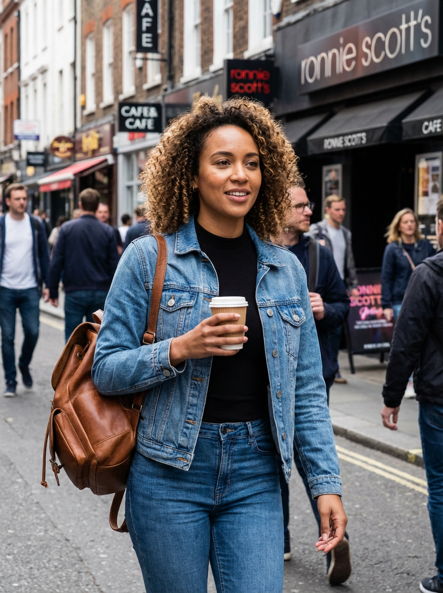 model as digital nomad in London in Soho background, with backpack