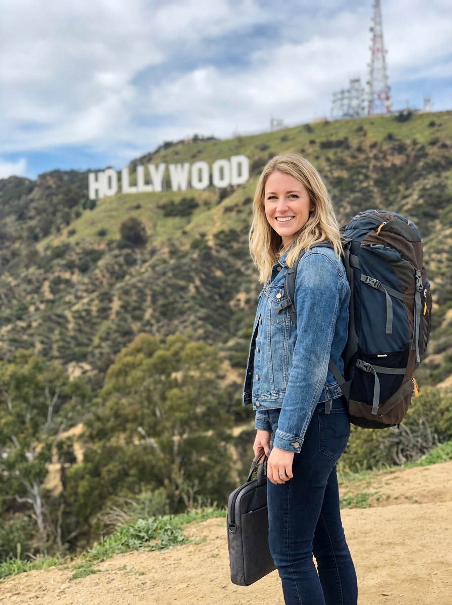 model as digital nomad in Los Angeles with the Hollywood sign in the background, with backpack