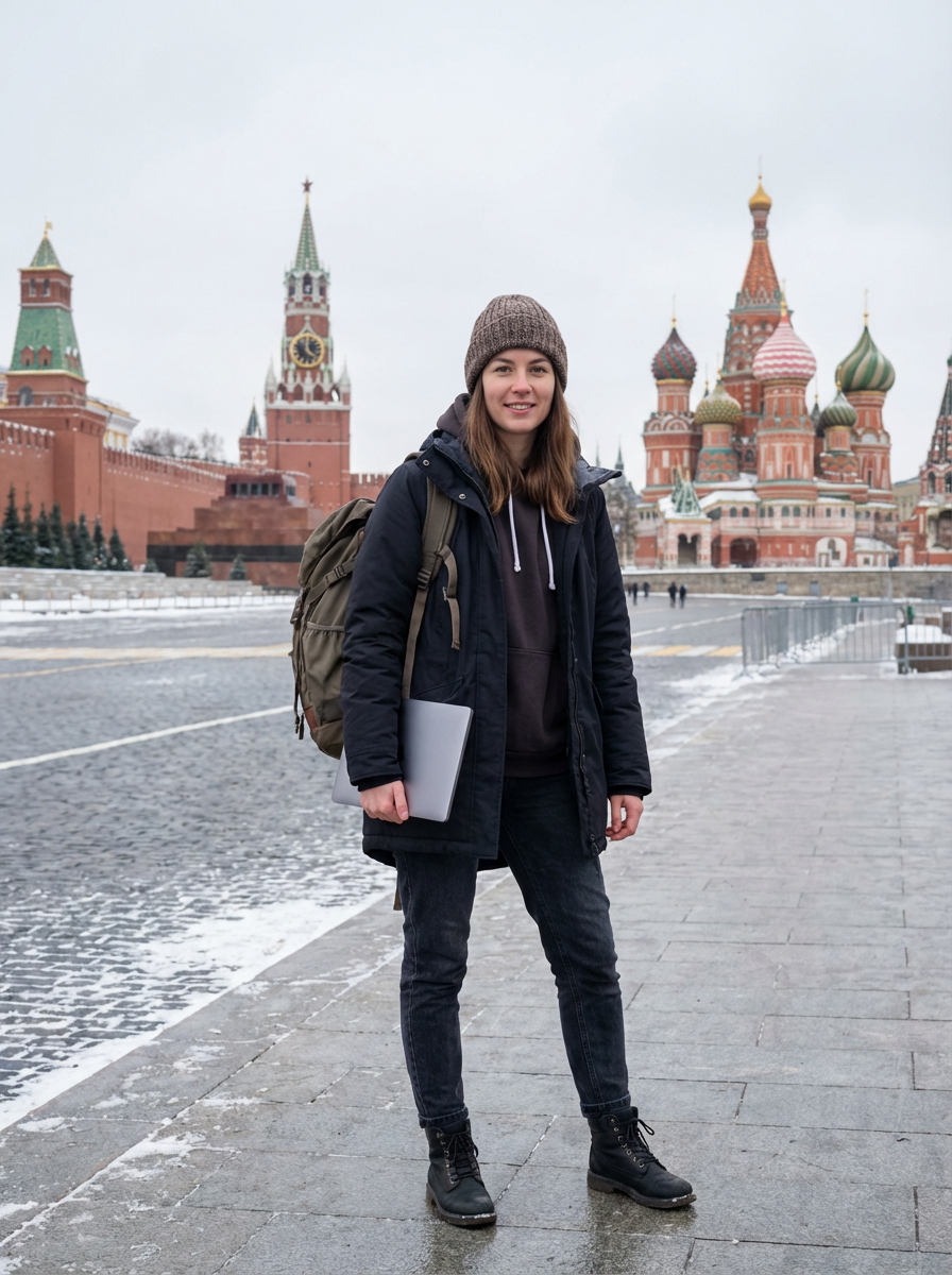 model as digital nomad in Moscow with the Kremlin in the background, with backpack