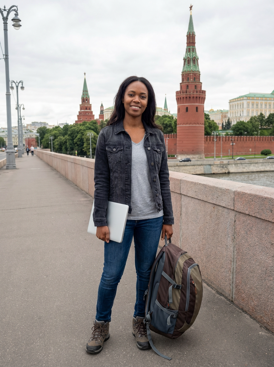 model as digital nomad in Moscow with the Kremlin in the background, with backpack