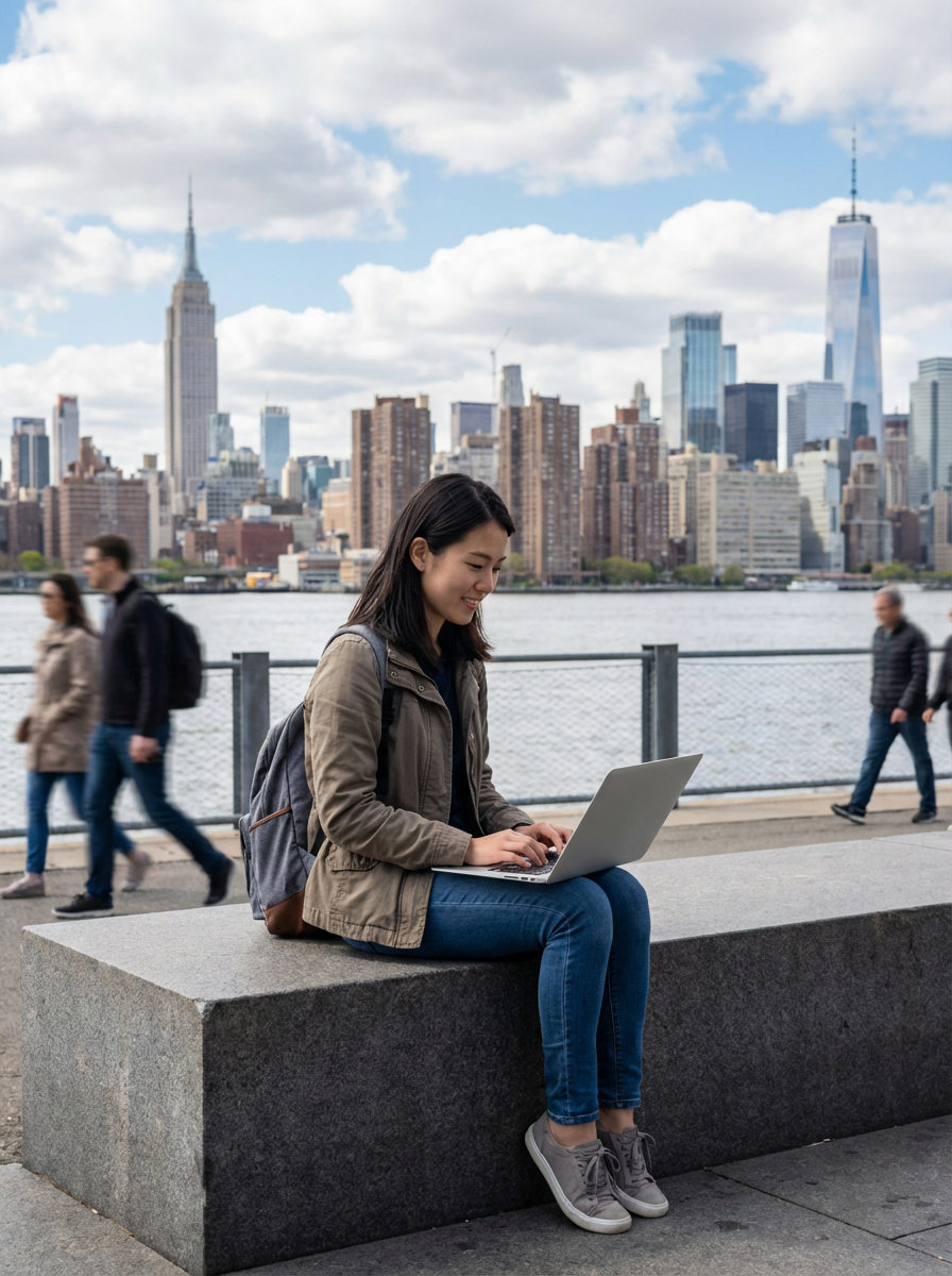 model as digital nomad in New York City with Manhattan in background, working on laptop