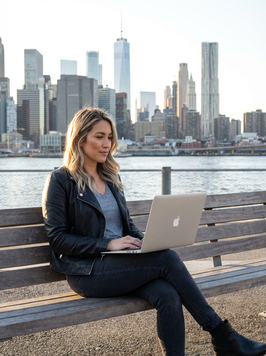 model as digital nomad in New York City with Manhattan in background, working on laptop