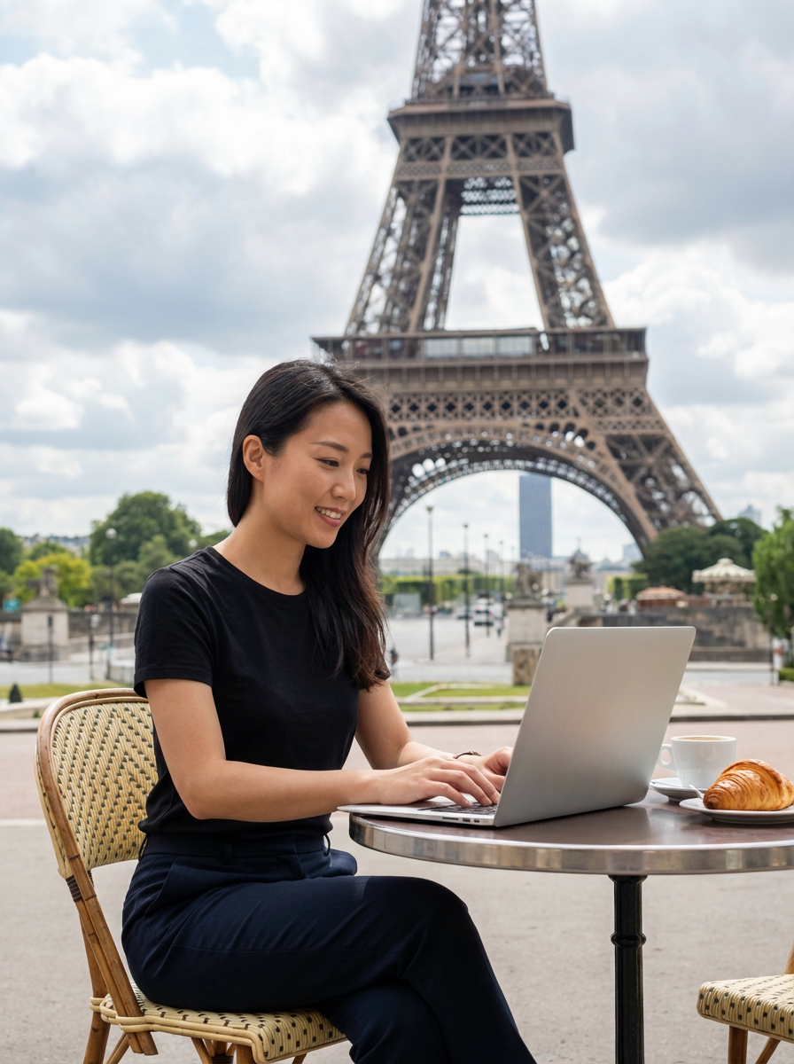 model as digital nomad in Paris with the Eiffel Tower in background, working on laptop