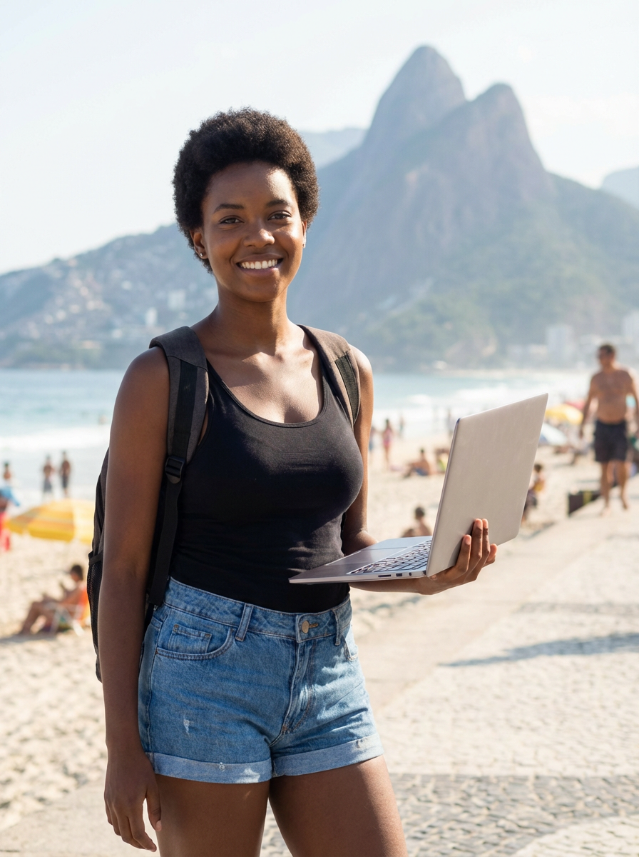 model as digital nomad in Rio de Janeiro at Ipanema Beach, with backpack
