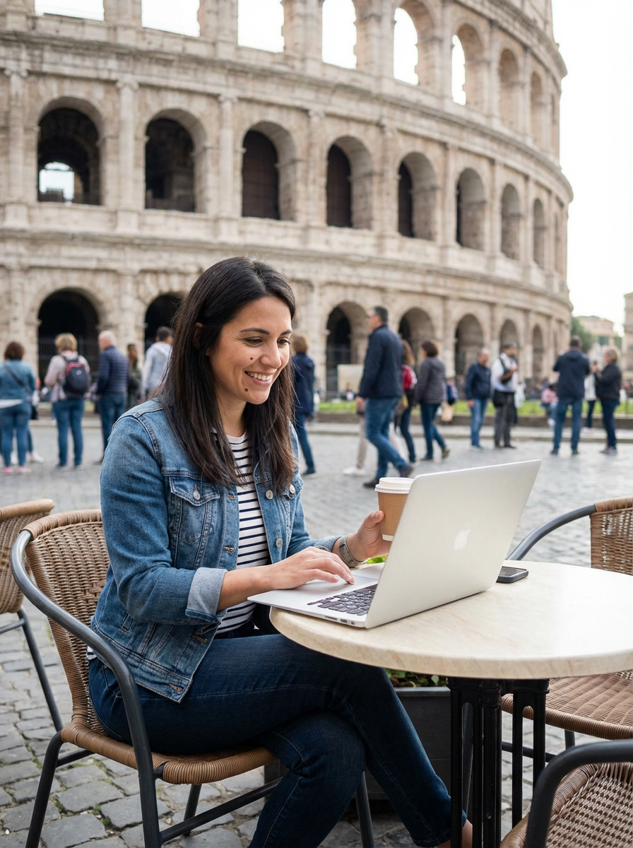 model as digital nomad in Rome with the Colosseum in the background, working on laptop